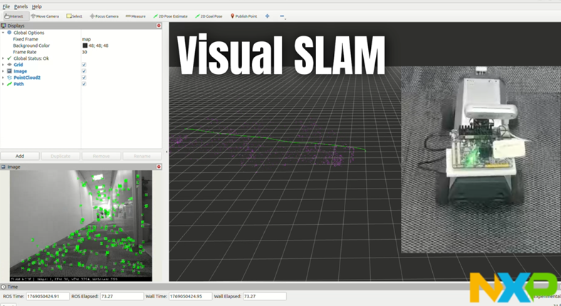 Visual SLAM showcases visual simultaneous localization and mapping (vSLAM) for autonomous navigation. The demo application uses camera input and ROS 2 nodes to build real-time maps and estimate robot position in dynamic environments.