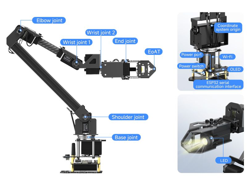 The following are annotations of various parts and commonly used interfaces of the robotic arm: