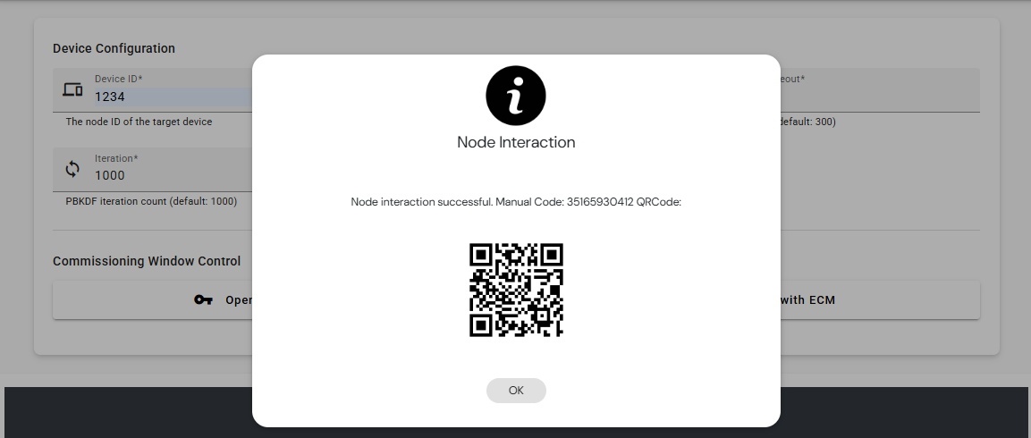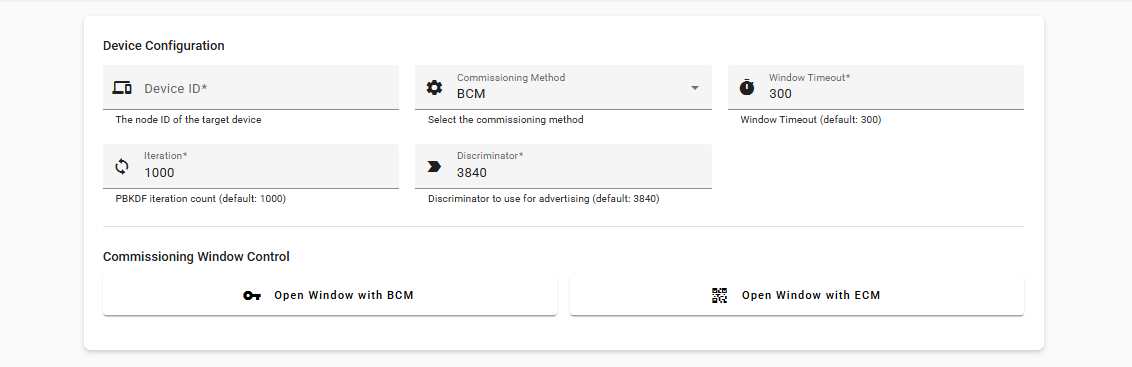 Enter Device ID, Commissioning Method, Window Timeout, Iteration and Discriminator. Then, click Open Window with BCM or Open Window with ECM button to trigger the Open Commissioning window: