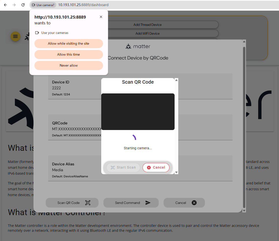 Then, click the Scan QR Code and Start Scan buttons. A window will pop up. Choose the “Allow while visiting the site” for camera permission for QR Code scanning.