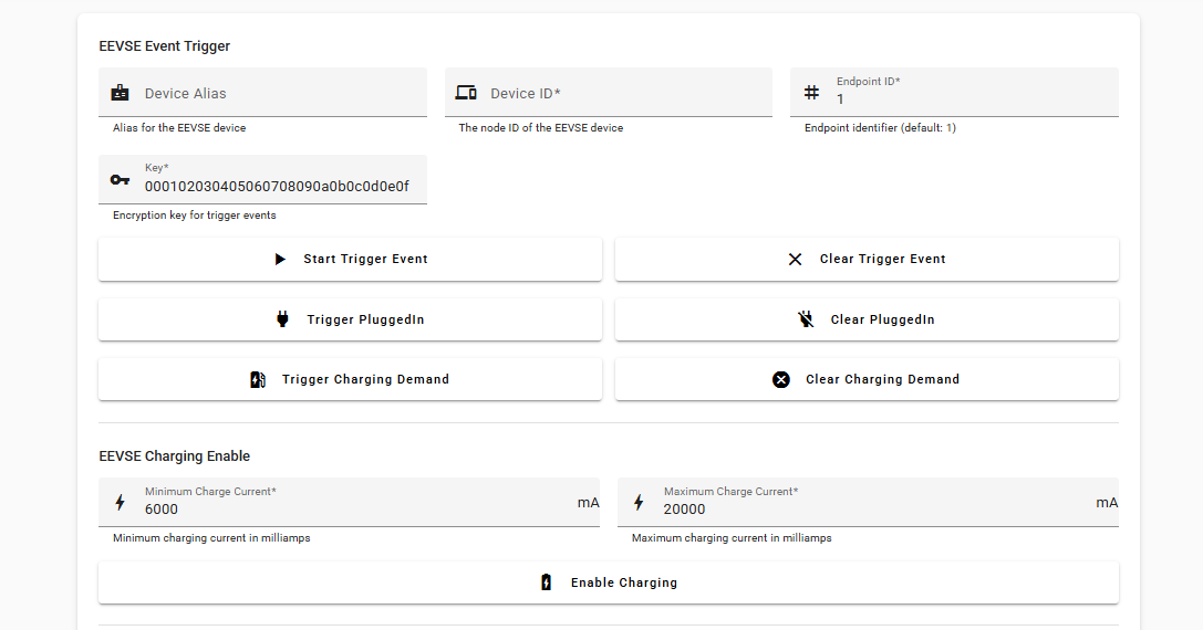 After the simulated charging demand event is triggered. Enter the value of Minimum Charge Current and Maximum Charge Current, and click the Enable Charging button to start charging by below commands.