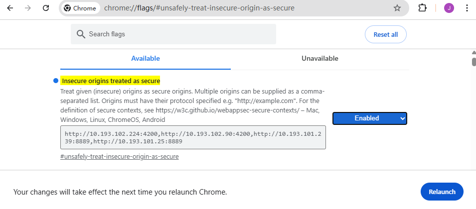 If you need to use the camera to scan the QR Code, you need to search for “chrome://flags/#unsafely-treat-insecure-origin-as-secure” in Chrome. Then, enter the “http://ip:port” and relaunch the browser like below: