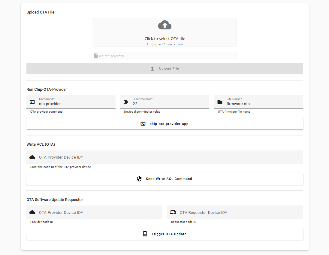 The chip-tool-web2 supports uploading OTA file and controlling OTA processing. Click the OTA Updates in sidebar, the following page displays: