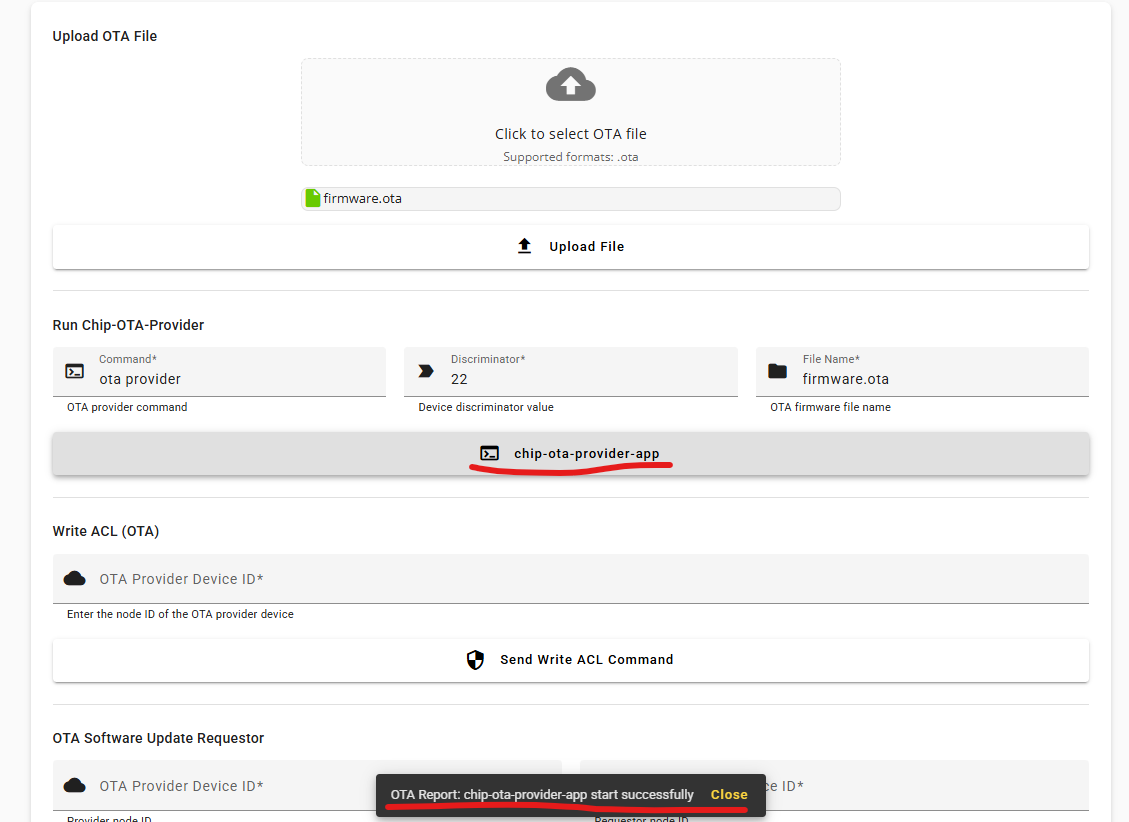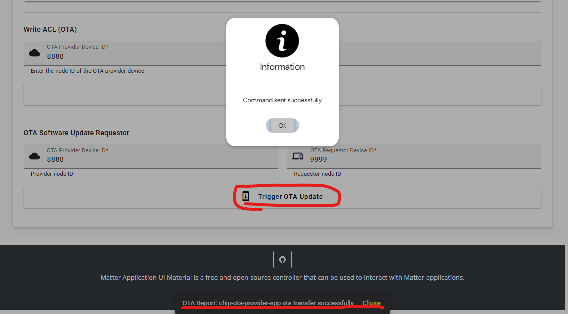 Enter the OTA Provider Device ID and OTA Requestor Device ID, then click the Send OTA software update requestor command button to start the OTA processing. Notice the pop-up information “OTA Report: chip-ota-provider-app ota transfer successfully” to confirm that the OTA process has finished.