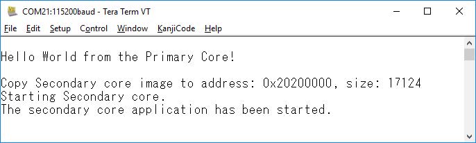 During the primary core code execution, the auxiliary core is released from the reset. The hello_world multicore application is now running and a banner is displayed on the terminal. If this does not appear, check the terminal settings and connections.