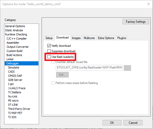 cm4project, uncheck Use flash loader(s), as shown in Figure 5, and change the contents of command line options as below:Target with SDRAM