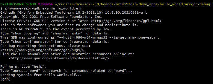 2. Run the command of arm-none-eabi-gdb.exe <application_name>.elf. For this example, it is arm-none-eabi-gdb.exe hello_world.elf.
