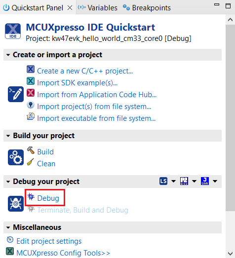 This section describes the steps required to configure MCUXpresso IDE to build, run, and debug example applications. The hello_world demo application targeted for the KW47-EVK hardware platform is used as an example, though these steps can be applied to any example application in the MCUXpresso SDK.
