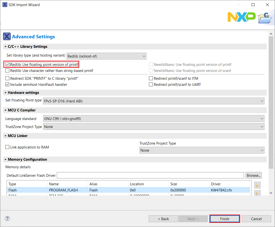 Ensure Redlib: Use floating point version of printf is selected if the example prints floating point numbers on the terminal for demo applications such as