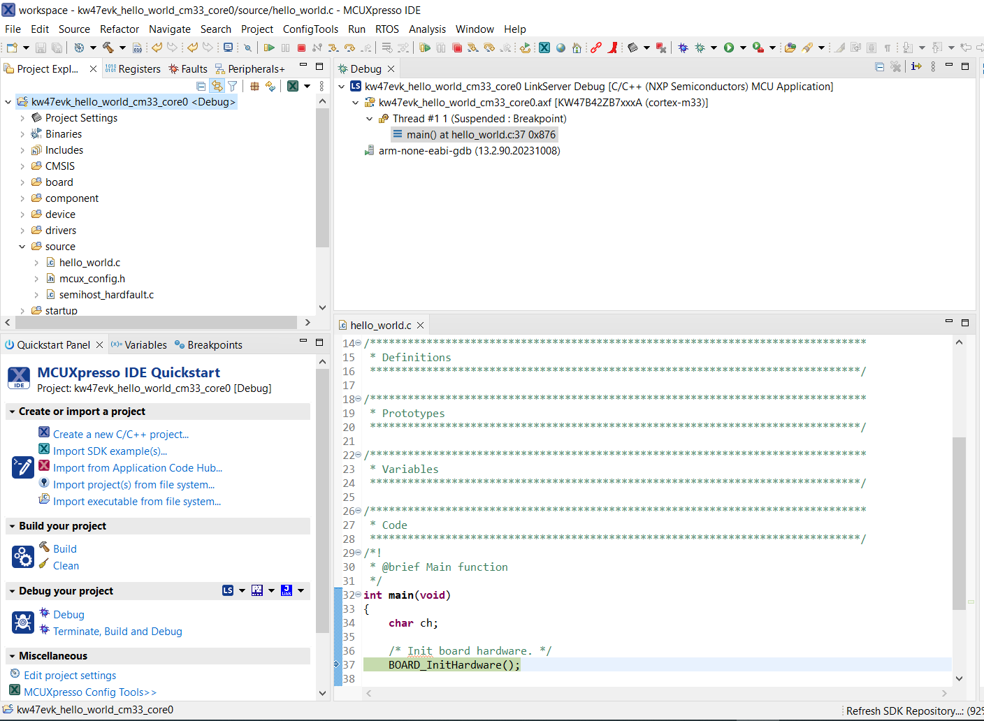 This section describes the steps required to configure MCUXpresso IDE to build, run, and debug example applications. The hello_world demo application targeted for the KW47-EVK hardware platform is used as an example, though these steps can be applied to any example application in the MCUXpresso SDK.