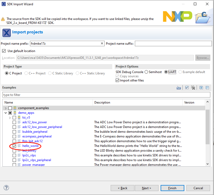 This section describes the steps required to configure MCUXpresso IDE to build, run, and debug example applications. The hello_world demo application targeted for the FRDM-KE17Z hardware platform is used as an example, though these steps can be applied to any example application in the MCUXpresso SDK.