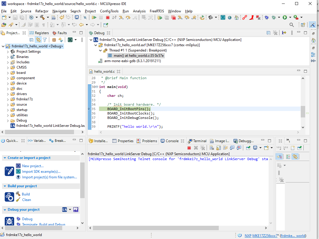frdmke17z_demo_apps_hello_world [Debug]to launch the debug session.|
