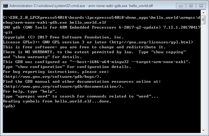 8. Run the command “arm-none-eabi-gdb.exe <application_name>.elf”. For this example, it is “arm-none-eabi-gdb.exe hello_world.elf”.