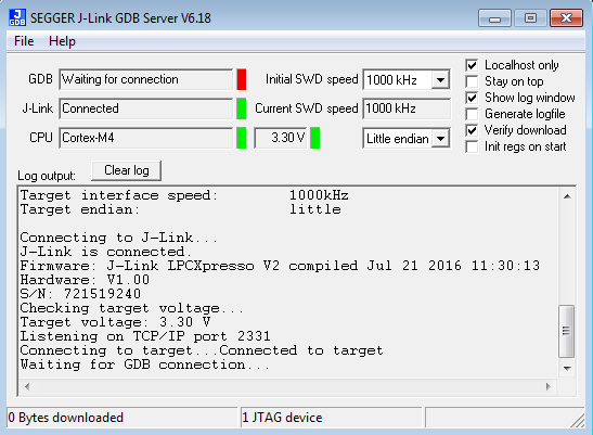 3. Open the J-Link GDB Server application. Assuming the J-Link software is installed, the application can be launched by going to the Windows operating system Start menu and selecting “Programs -> SEGGER -> J-Link <version> J-Link GDB Server”.