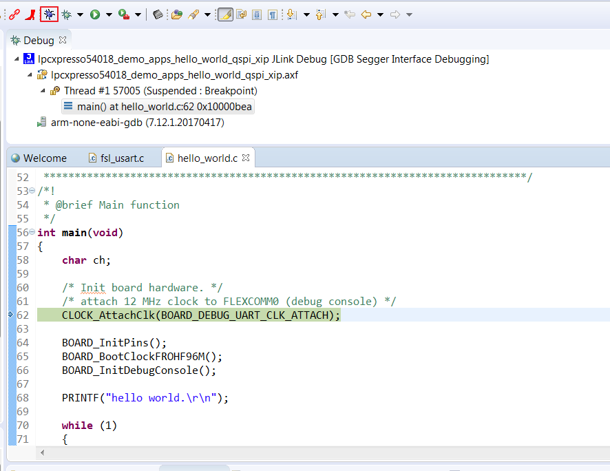 1. Click the “Debug” button on the tool bar to run the XIP example.
