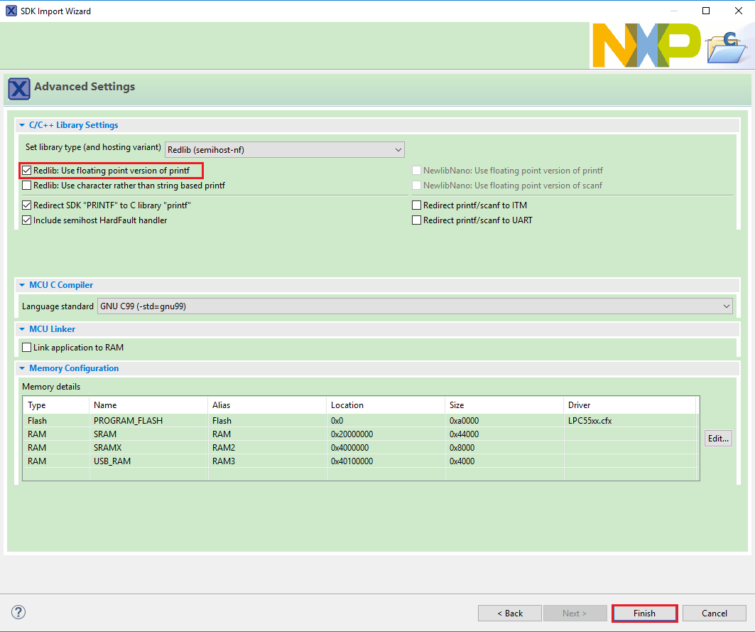 1. Ensure Redlib: Use floating-point version of printf is selected if the example prints floating-point numbers on the terminalfor demo applications such as adc_basic, adc_burst, adc_dma, and adc_interrupt. Otherwise, it is not necessary to select this option. Then, click Finish.
