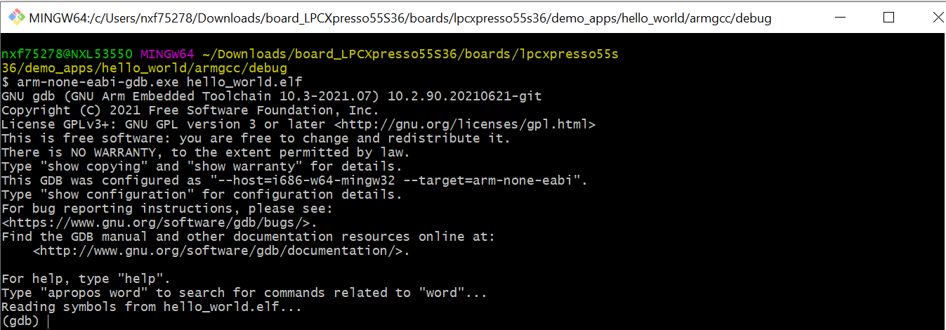 2. Run the arm-none-eabi-gdb.exe <application_name>.elf command. For this example, it is arm-none-eabi-gdb.exe hello_world.elf.
