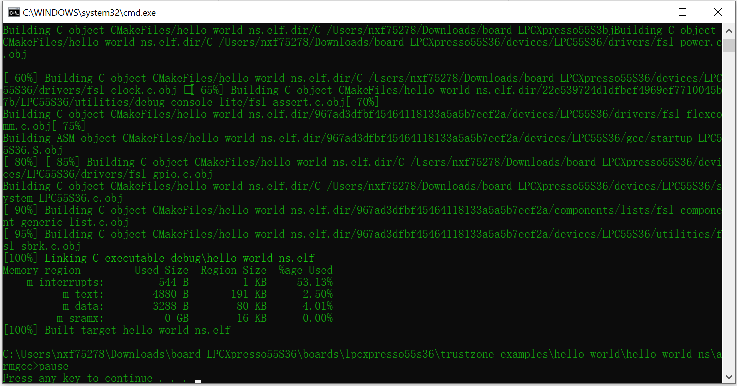 6. load <install\_dir\>/boards/lpcxpresso55s36/trustzone\_examples/hello\_world/cm33\_core0/hello\_world\_s/armgcc/debug/hello\_world\_s.elf