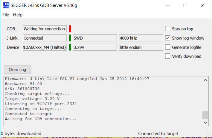 1. Open the J-Link GDB Server application. Assuming the J-Link software is installed, the application can be launched by going to the Windows operating system Start menu and selecting Programs -> SEGGER -> J-Link <version> J-Link GDB Server.