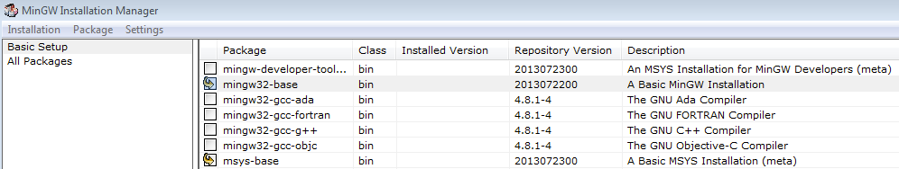 3. Ensure that the mingw32-base and msys-base are selected under Basic Setup.