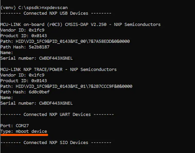 Once the device is connected you may check your devices available using SPSDK to find the COM port it is connected to.