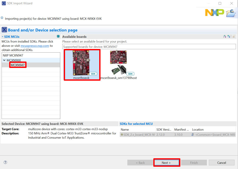 In the window that appears, expand the MCXN9XX folder and select MCXN947 . Then, select mcxn9xxevk and click Next.