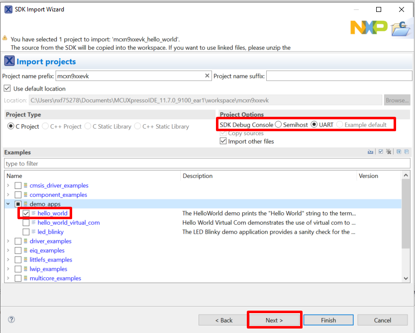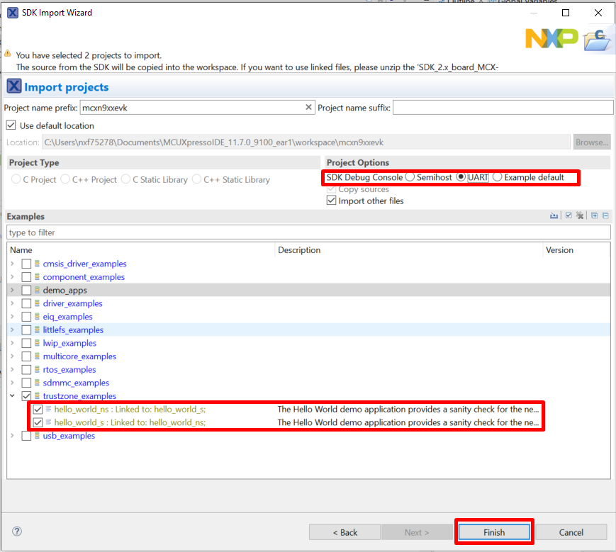 Expand the trustzone_examples/ folder and select hello_world_s. Because TrustZone examples are linked together, the non-secure project is automatically imported with the secure project, and there is no need to select it explicitly. Then select UART as SDK Debug Console. Then, click Finish.