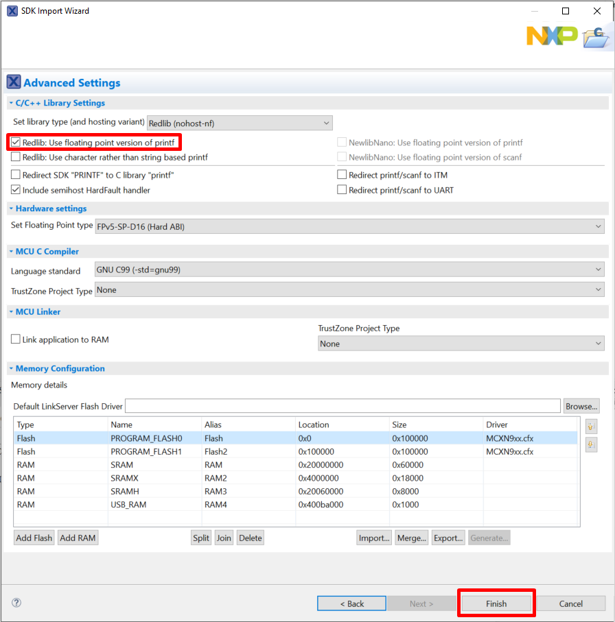Ensure Redlib: Use floating point version of printf is selected if the example prints floating point numbers on the terminal for demo applications such as
