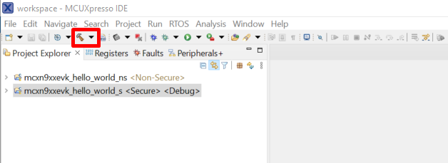 Now, two projects should be imported into the workspace. To start building the TrustZone application, highlight the mcxn9xxevk_hello_world_s project (TrustZone master project) in the Project Explorer. Then, choose the appropriate build target, Debug or Release, by clicking the downward facing arrow next to the hammer icon, as shown in Figure 3. For this example, select the Debug target.