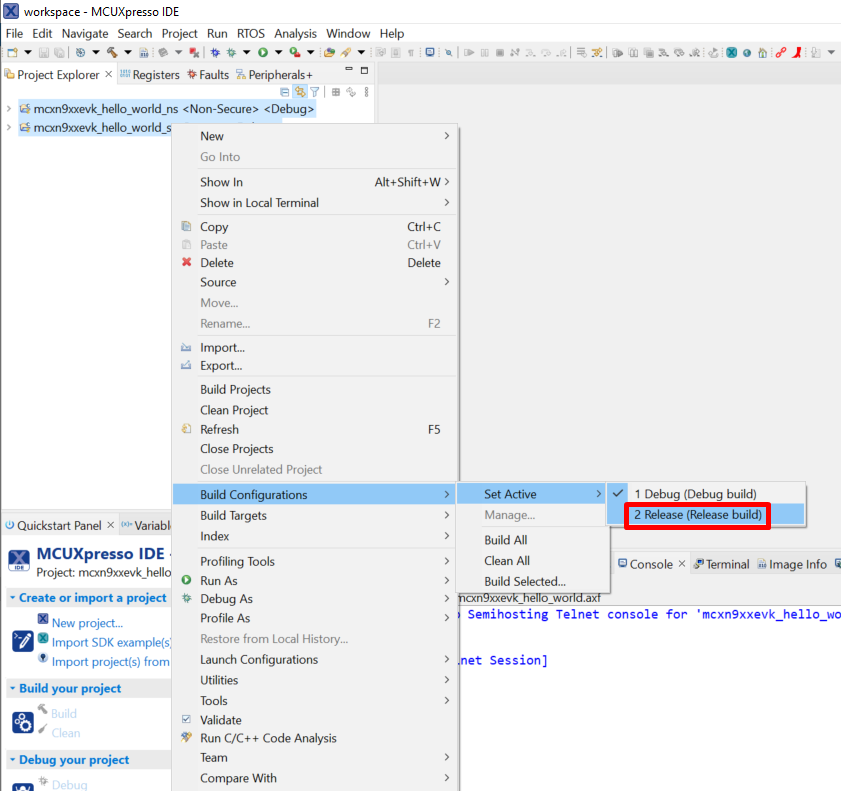 When the Release build is requested, it is necessary to change the build configuration of both the secure and non-secure application projects first. To do this, select both projects in the Project Explorer view by clicking to select the first project, then using shift-click or control-click to select the second project. Right click in the Project Explorer view to display the context-sensitive menu and select Build Configurations > Set Active > Release. This is also possible by using the menu item of Project > Build Configuration > Set Active > Release. After switching to the Release build configuration. Build the application for the secure project first.