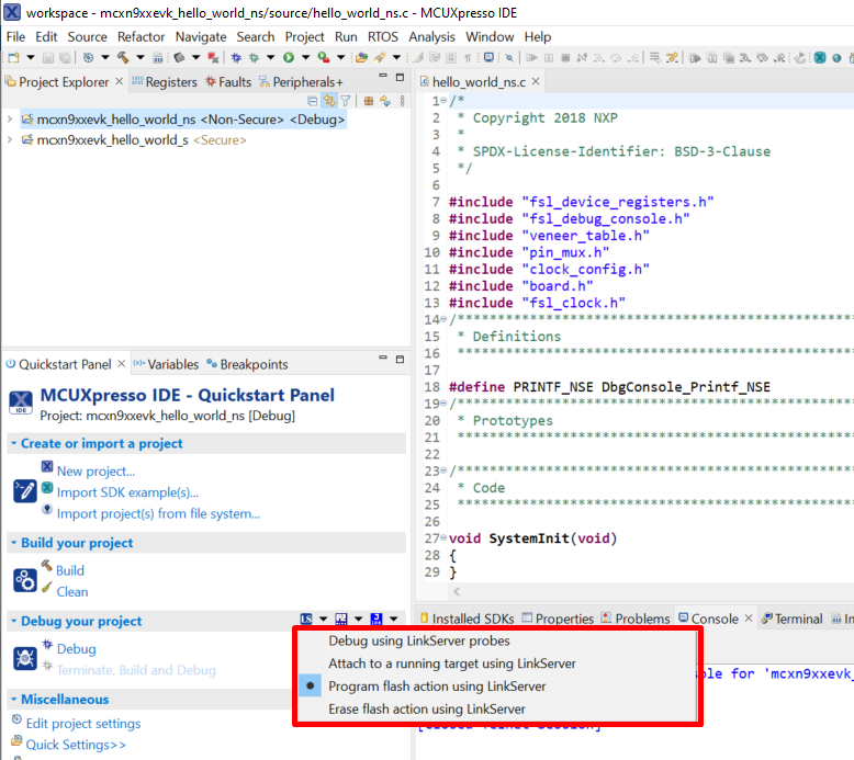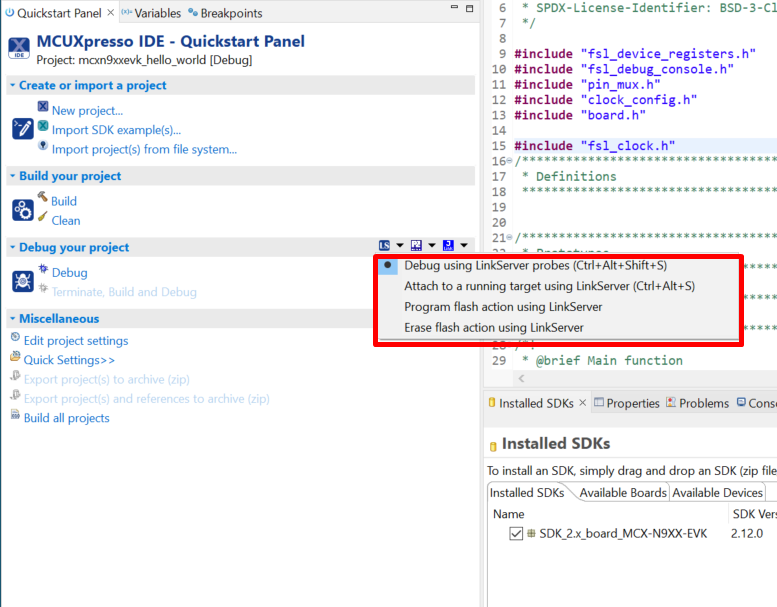 This section describes the steps required to configure MCUXpresso IDE to build, run, and debug example applications. The hello_world demo application targeted for the MCX-N9XX-EVK hardware platform is used as an example, though these steps can be applied to any example application in the MCUXpresso SDK.
