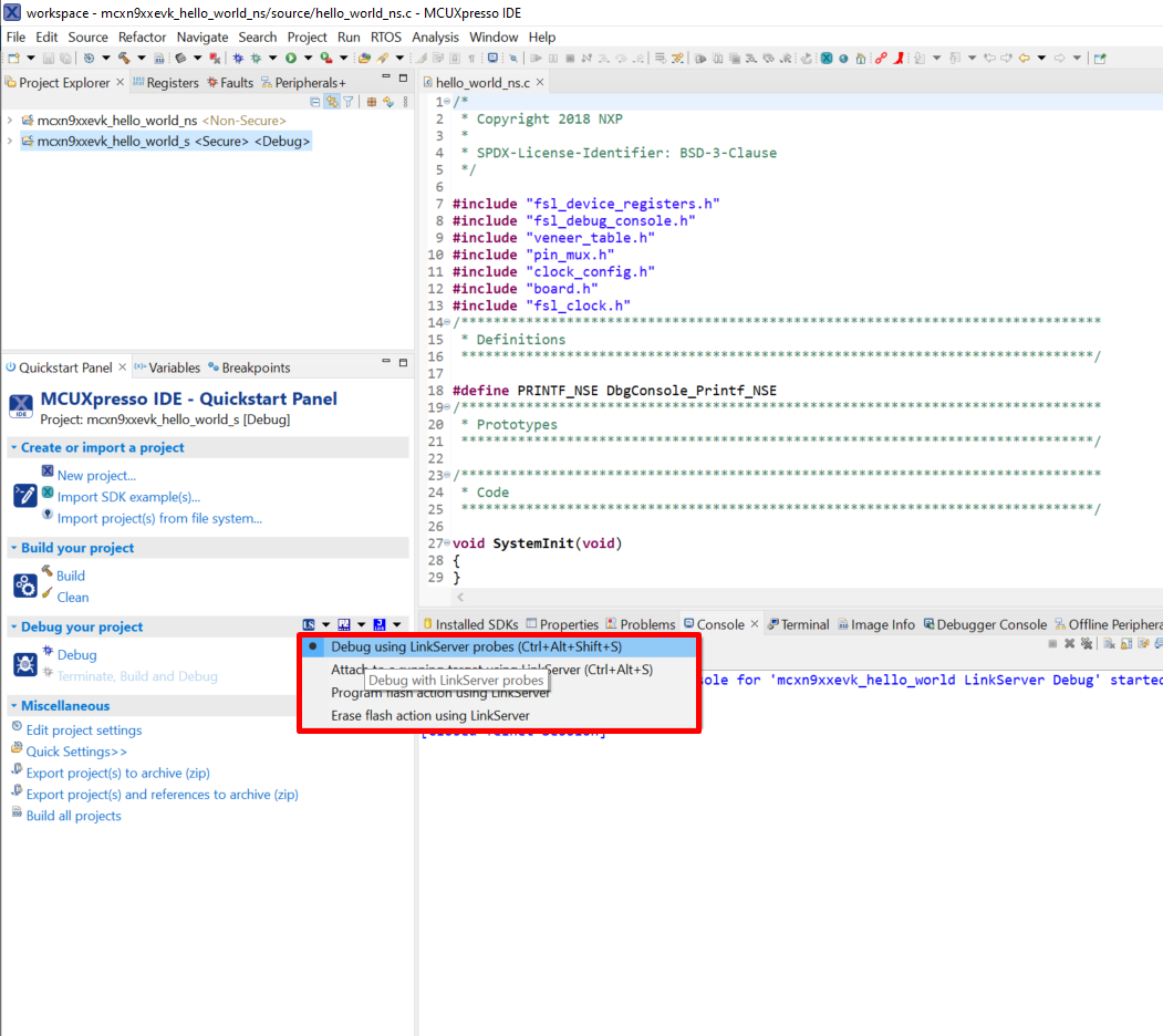 This section describes the steps required to configure MCUXpresso IDE to build, run, and debug TrustZone example applications. The trustzone version of the hello_world example application targeted for the MCX-N9XX-EVK hardware platform is used as an example, though these steps can be applied to any TrustZone example application in the MCUXpresso SDK.