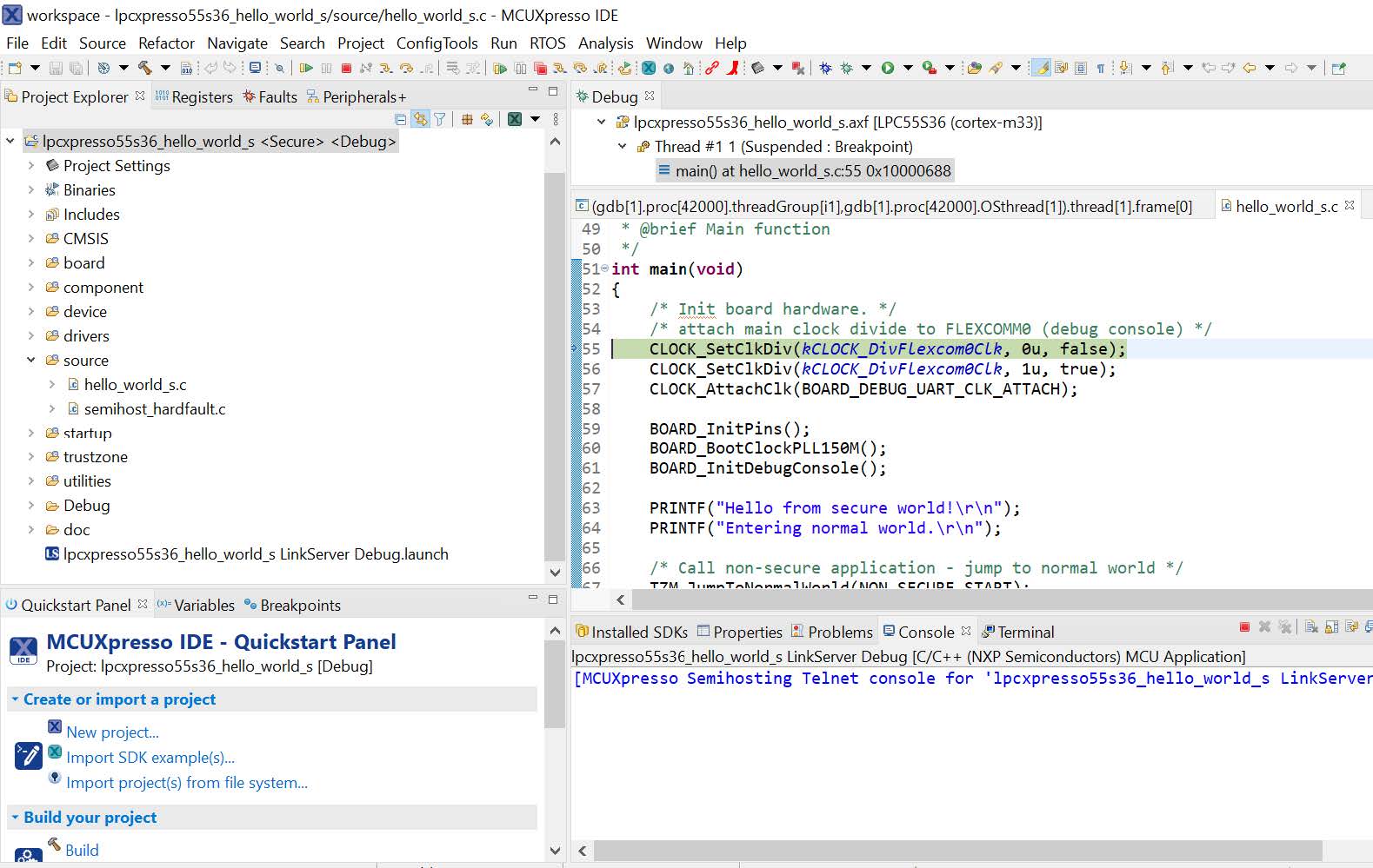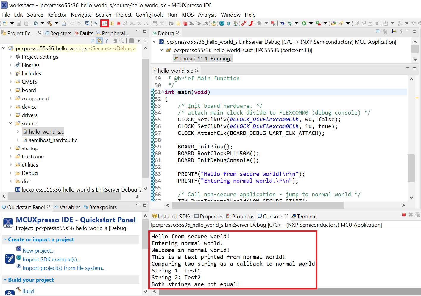 On the Quickstart Panel, click on Debug mcxn9xxevk_hello_world [Debug] to launch the debug session.