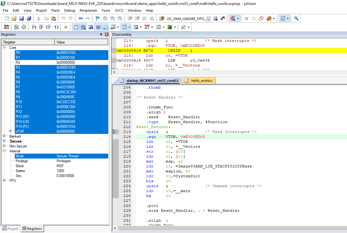 <demo_name>.uvmpw. For this specific example, the actual path is:<install_dir>/boards/mcxn9xxevk/demo_apps/hello_world/mdk/hello_world.uvmpw