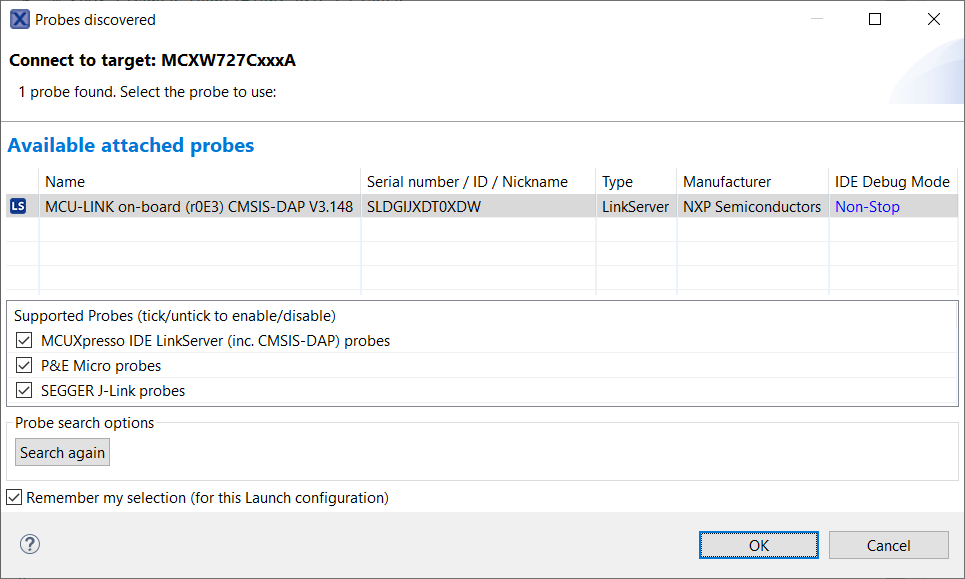 The first time you debug a project, the Debug Emulator Selection dialog is displayed, showing all supported probes that are attached to your computer. Select the probe through which you want to debug and click OK. (For any future debug sessions, the stored probe selection is automatically used, unless the probe cannot be found.)
