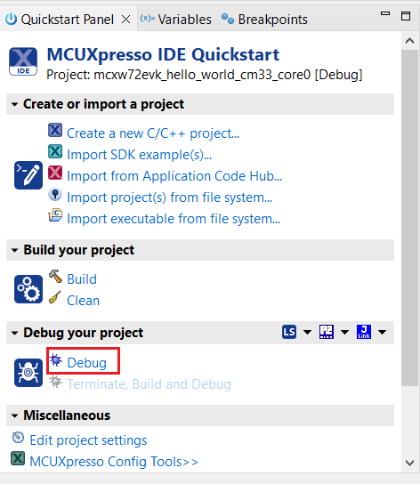This section describes the steps required to configure MCUXpresso IDE to build, run, and debug example applications. The hello_world demo application targeted for the MCX-W72-EVK hardware platform is used as an example, though these steps can be applied to any example application in the MCUXpresso SDK.
