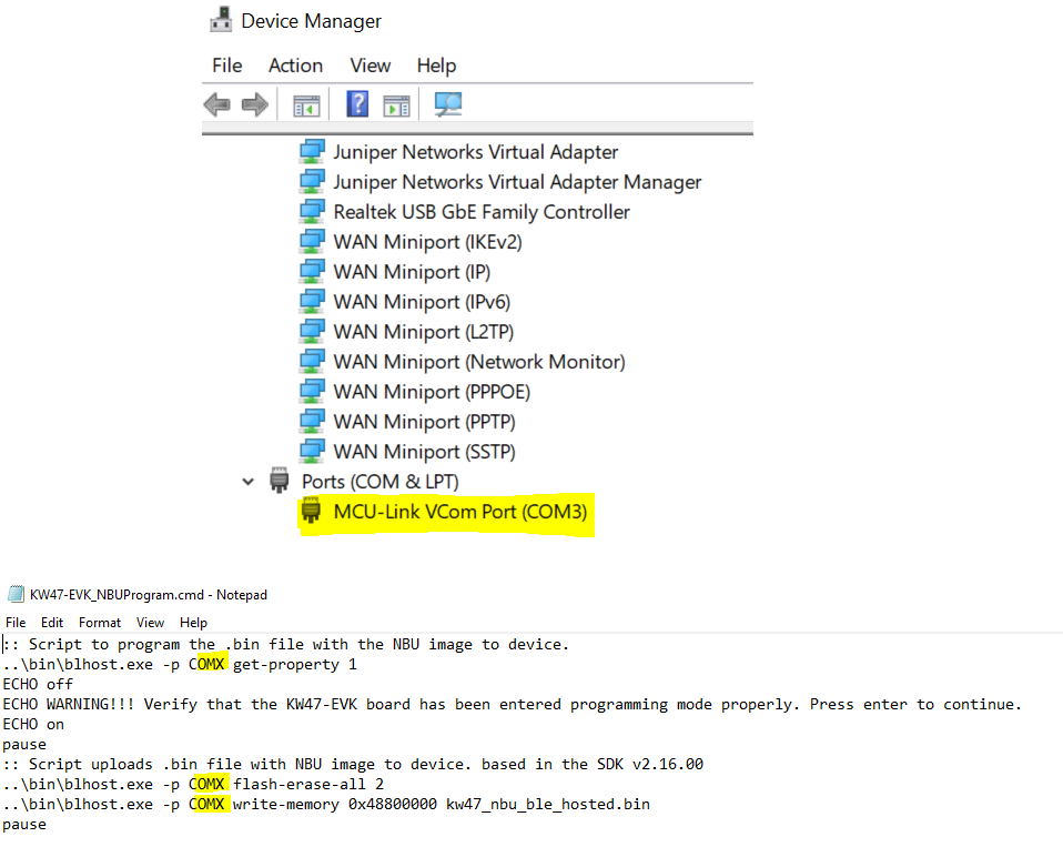 Open the 04. Tools folder that comes together with this document and go to the script folder. Locate the KW47-EVK_NBUProgram.cmd and open it using any text editor. Replace all the references to COMX with the COM Port assigned to your MCXW72-LOC board. Save the changes applied to the script.