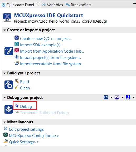 This section describes the steps required to configure MCUXpresso IDE to build, run, and debug example applications. The hello_world demo application targeted for the MCXW72-LOC hardware platform is used as an example, though these steps can be applied to any example application in the MCUXpresso SDK.