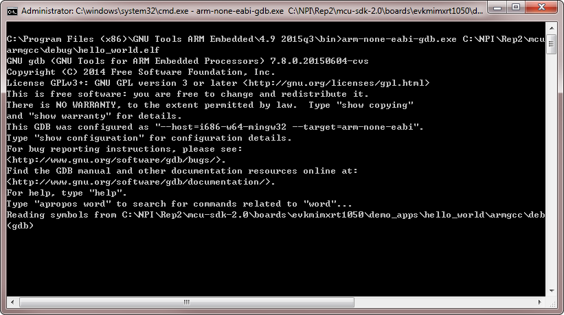 9. Run the arm-none-eabi-gdb.exe <application_name>.elf. For this example, it is arm-none-eabi-gdb.exe hello_world.elf.