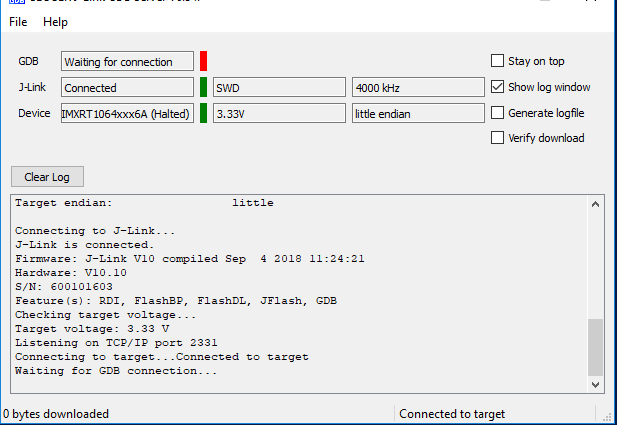 4. Open the J-Link GDB Server application. Go to the SEGGER install folder. For example, C:\Program Files(x86)\SEGGER\JLink_Vxxx. Open the command windows. For Debug and Release targets, use the JLinkGDBServer.exe command. For the sdram_debug, sdram_release, flexspi_nor_sdram_debug, and flexspi_nor_sdram_release targets, use the JLinkGDBServer.exe-scriptfile <install_dir>/boards/evkmimxrt1050/demo_apps/hello_world/evkmimxrt1050_sdram_init.jlinkscript command