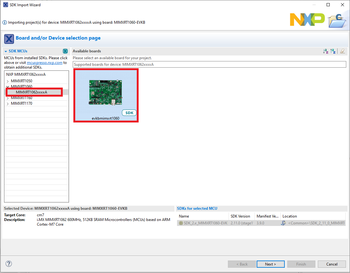 In the window that appears, expand the MIMXRT1060 folder and select. **** Then, select evkbmimxrt1060 and click Next, as shown in Figure 3.