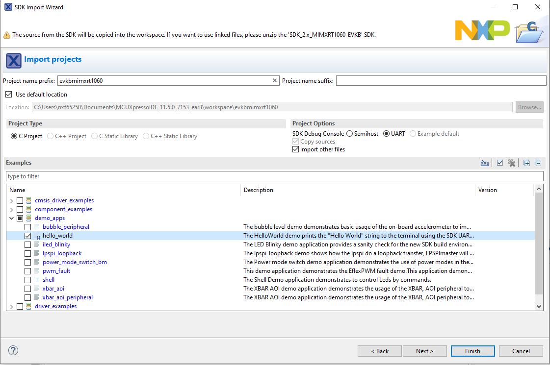 dac32_adc12,dac_adc,dac_cadc,ecompass,sai,coremark,mbedtls_benchmark,wolfssl_benchmark, and formmcau_examplessuch asmmcau_api). Otherwise, there is no need to select it. Click Finish.|