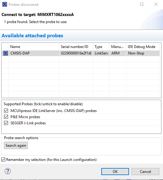 The first time you debug a project, the Debug Emulator Selection Dialog is displayed, showing all supported probes that are attached to your computer. Select the probe through which you want to debug and click OK. (For any future debug sessions, the stored probe selection is automatically used, unless the probe cannot be found.)