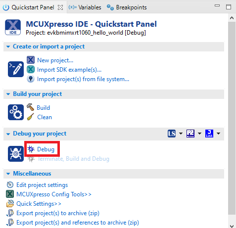 On the Quickstart Panel, click Debug evkbmimxrt1060_demo_apps_hello_world [Debug].