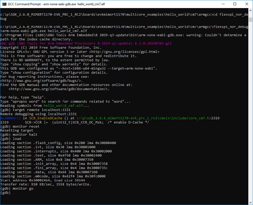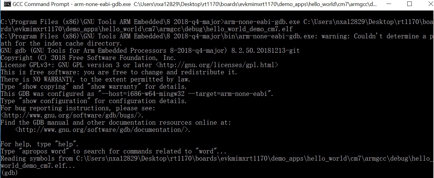 arm-none-eabi-gdb.exe <application_name>.elf. For this example, it isarm-none-eabi-gdb.exe hello_world.elf.