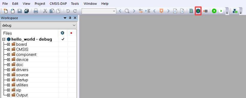 flexspi_nor_release - Project configuration is same as release target. The linker file is flexspi_nor linker, where text is put in flash and data put in TCM. For this example, select the “hello_world – Debug” target.
