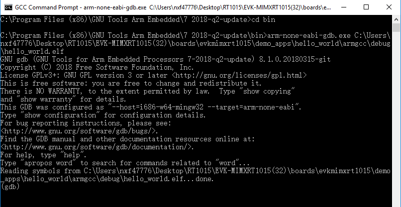 9. Run the arm-none-eabi-gdb.exe <application_name>.elf. For this example, it is arm-none-eabi-gdb.exe hello_world.elf.