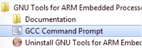 1. Open a GCC Arm Embedded tool chain command window. To launch the window, from the Windows operating system Start menu, go to Programs >GNU Tools Arm Embedded <version> and select GCC Command Prompt.