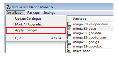 Ensure that the mingw32-base and msys-base are selected under Basic Setup.