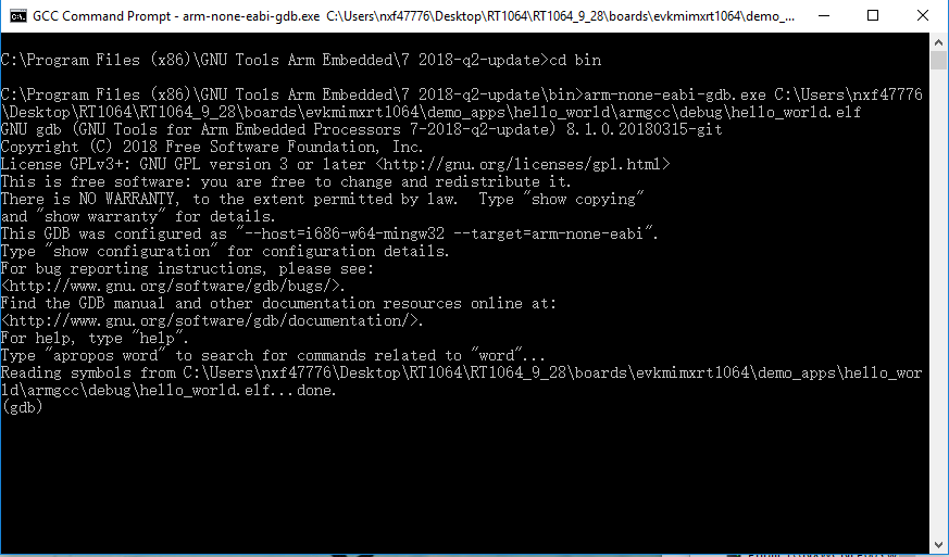 arm-none-eabi-gdb.exe <application_name>.elf. For this example, it isarm-none-eabi-gdb.exe hello_world.elf.|